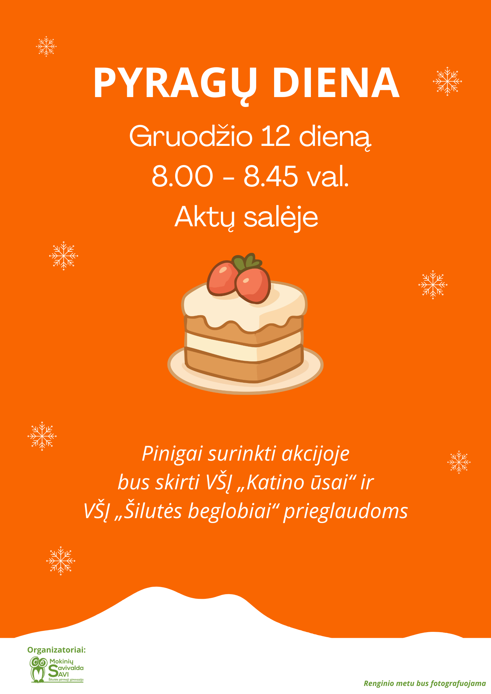 Renginio metu gimnazistai pardavinės savo pačių keptus gardėsius. Visi surinkti pinigai bus skiriami paramai VšĮ „Katino ūsai“ ir VšĮ „Šilutės beglobiai“ gyvūnų prieglaudoms. Tai puiki galimybė prisidėti prie kilnaus tikslo ir kartu pasidžiaugti artėjančiomis šventėmis.