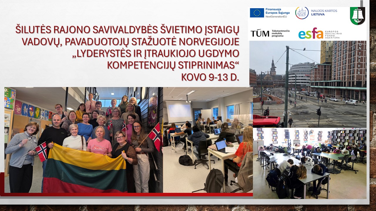 Projekto „Tūkstantmečio mokyklos II“ Šilutės „Vandenvėja“ programos Lyderystės veikiant komanda organizavo kovo 9-13 dienomis 15 Šilutės rajono savivaldybės švietimo įstaigų vadovų ir pavaduotojų stažuotę Norvegijoje pagal Lyderystės ir įtraukiojo ugdymo kompetencijų stiprinimo programą. Stažuotės dalyviai lankėsi pagal programą numatytose mokyklose, susipažino su Oslo miestu ir Norvegijos švietimo sistema. Iš mūsų gimnazijos stažuotėje dalyvavo pavaduotojos ugdymui L. A. Eglinskienė ir D. Jakienė.