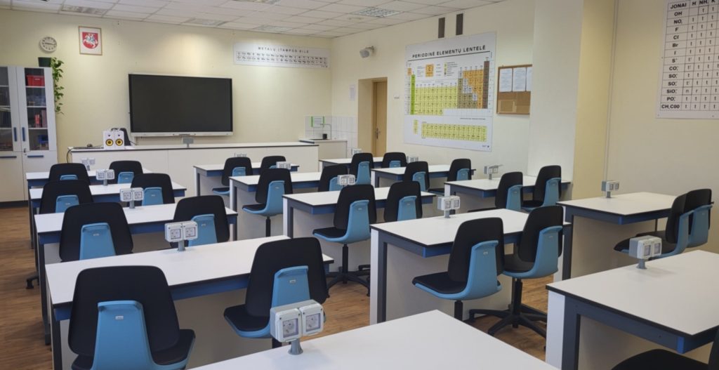 Chemijos ir biologijos laboratorija yra moderniausią ir erdviausią iš visų gimnazijoje naujai įrengtų erdvių. Erdvėje įrengta centrinė sala, kurioje yra įdiegti elektros jungikliai, papildomi šviesos šaltiniai. Centrinėje saloje yra 16 darbo vietų, kuriose mokiniai gali dirbti grupėse arba po vieną. Aplink salą yra įrengta dar 12 darbo vietų, vandens tiekimas. Laboratorija pritaikyta tiek cheminiams eksperimentams, tiek biologijos praktiniams darbams, užtikrinant saugią ir šiuolaikišką aplinką, kurioje moksleiviai gali pasijusti tikrais mokslininkais ir žengti pirmuosius tyrėjo žingsnius.